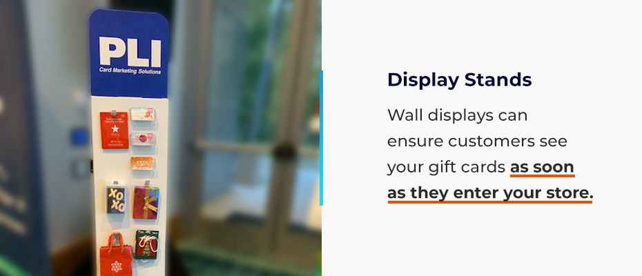 Depending on your gift card’s location, customers might overlook your cards or not know you offer them. Designing attractive display stands can accentuate your cards and make them pop so customers are more likely to purchase them. Wall displays can also ensure customers see your gift cards as soon as they enter your store.